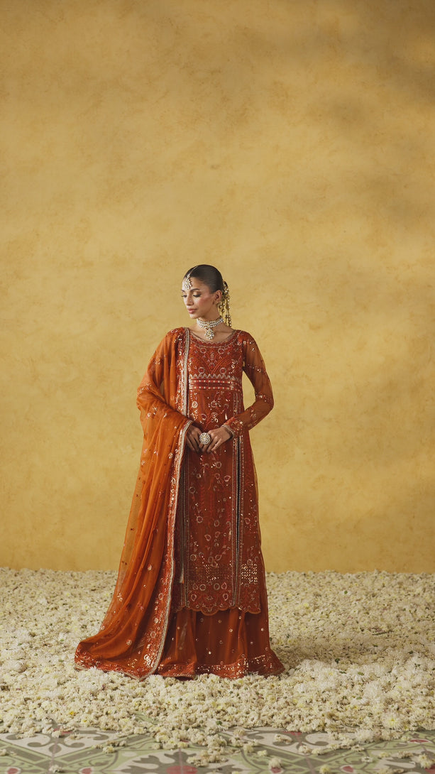 A breathtaking masterpiece of fire and earth, where tonal textures create a landscape of pure luxury. This rust-hued ensemble celebrates the power of a single color reimagined through gold zari, sequins, and tonal threadwork. The look is amplified by a voluminous lehenga that ripples with golden light, creating a silhouette of immense drama. Completed by a beautifully embroidered dupatta, this ensemble is for the woman who desires a look that is as bold as it is refined.