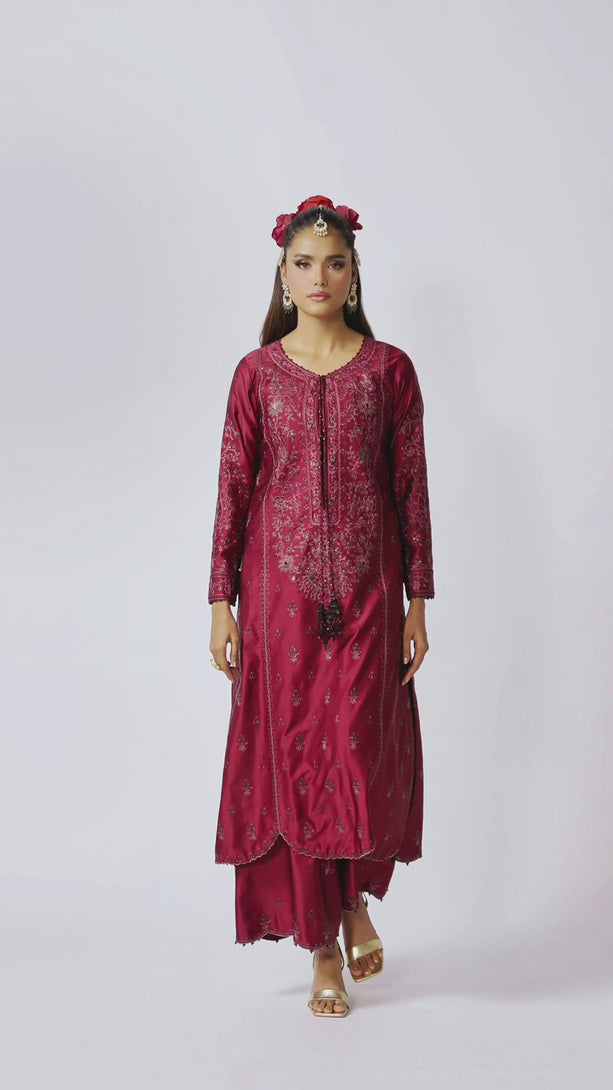 A rich maroon hue drapes this charmeuse silk ensemble in a luxurious, silky sheen. The shirt is adorned with glimmering black cupped sequins, their subtle sparkle beautifully balanced by delicate threadwork in dusty pink, sage green, and maroon, a tapestry of tones that adds depth and dimension to every detail. A scalloped hemline graces the shirt, lending a refined feminine finish. Paired with intricately embroidered trousers that echo the artistry above, the look comes together as a harmonious blend of elegance and contemporary grace, perfect for occasions that call for understated sophistication.