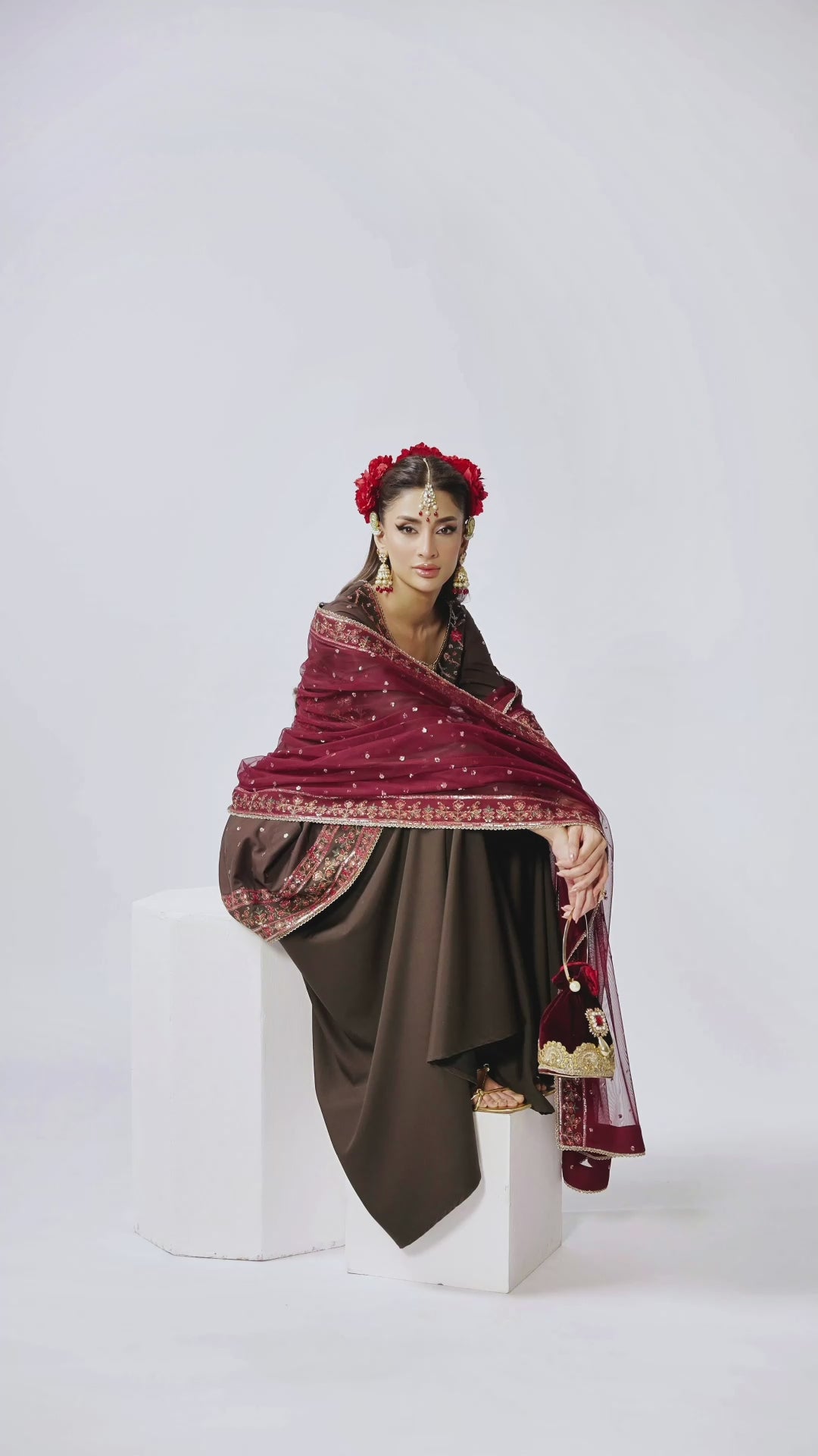 A warm brown ensemble wrapped in earthy elegance, its surface brought to life with maroon and rust threadwork that adds depth and richness to every motif. Light gold sequins scatter a soft shimmer across the fabric, while two-toned gold zari lends a refined, luminous touch. Designed for styling freedom, the shirt can be fashioned into a waistcoat or worn as a straight shirt, allowing the silhouette to shift effortlessly with your mood and occasion. Paired with an embroidered dupatta in a contrasting magenta shade, the look strikes a beautiful balance between versatility, tradition, and standout charm.