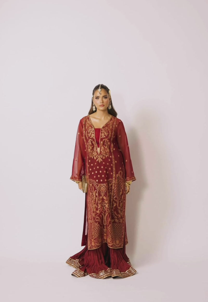 A deep maroon ensemble exudes timeless elegance, with the shirt beautifully adorned in rust threadwork and antique two-toned gold zari and sequins that catch the light with subtle radiance. Designed for versatility, the shirt can be styled as a straight shirt or tailored to your personal preference, offering effortless adaptability. Paired with an intricately embroidered dupatta, the ensemble combines classic charm with contemporary freedom, perfect for festive or celebratory occasions.