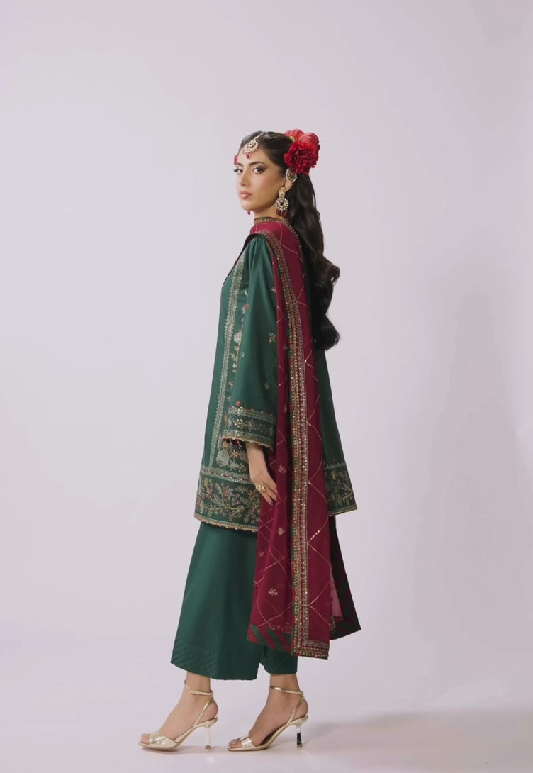 A rich bottle green ensemble comes alive with delicate detailing, where light gold zari and sequins shimmer softly against the fabric, complemented by aqua blue and maroon threadwork that adds depth and character. The shirt offers styling flexibility, allowing it to be worn as either a short or long silhouette. Paired with a gorgeous jaal-embroidered dupatta in a contrasting maroon shade, the look strikes a perfect balance of elegance, vibrance, and refined sophistication.