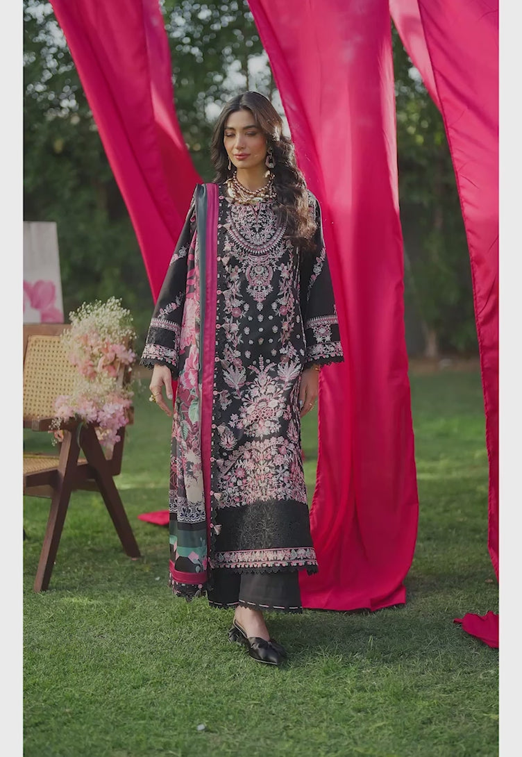 Enshrouded in the mystery of the night, this black ensemble is a breathtaking composition of layered luxury and refined artistry. The shirt is exquisitely embroidered with pink, mint, and greyish-beige threads that glow beautifully against the dark base, creating a striking visual contrast. Sheer organza inserts are artfully blended into the design, further enhanced by sculpted 3D floral bunches that appear to bloom organically from the fabric. Finished with a tonal black-on-black embroidered border that adds structure and regality, and paired with a digitally printed charmeuse silk dupatta, this ensemble is the ultimate expression of elevated elegance.