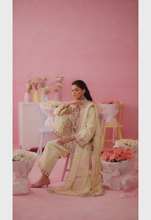 Bathed in the golden glow of a perennial summer, this light yellow ensemble is a breathtaking revival of high-period opulence, reminiscent of the extravagant floral designs found in Rococo tapestries. The shirt is a masterpiece of exuberant detail, where a vibrant garden of light pink, fuchsia, light green, and peach threads blossoms with decadent precision. Every stitch pays homage to an era of grandeur, creating a visual feast that is both intricate and celebratory. Complemented by trousers featuring a signature artisanal border and a gorgeously embroidered chiffon dupatta, this ensemble is a sun-drenched symphony of historical charm and modern luxury.