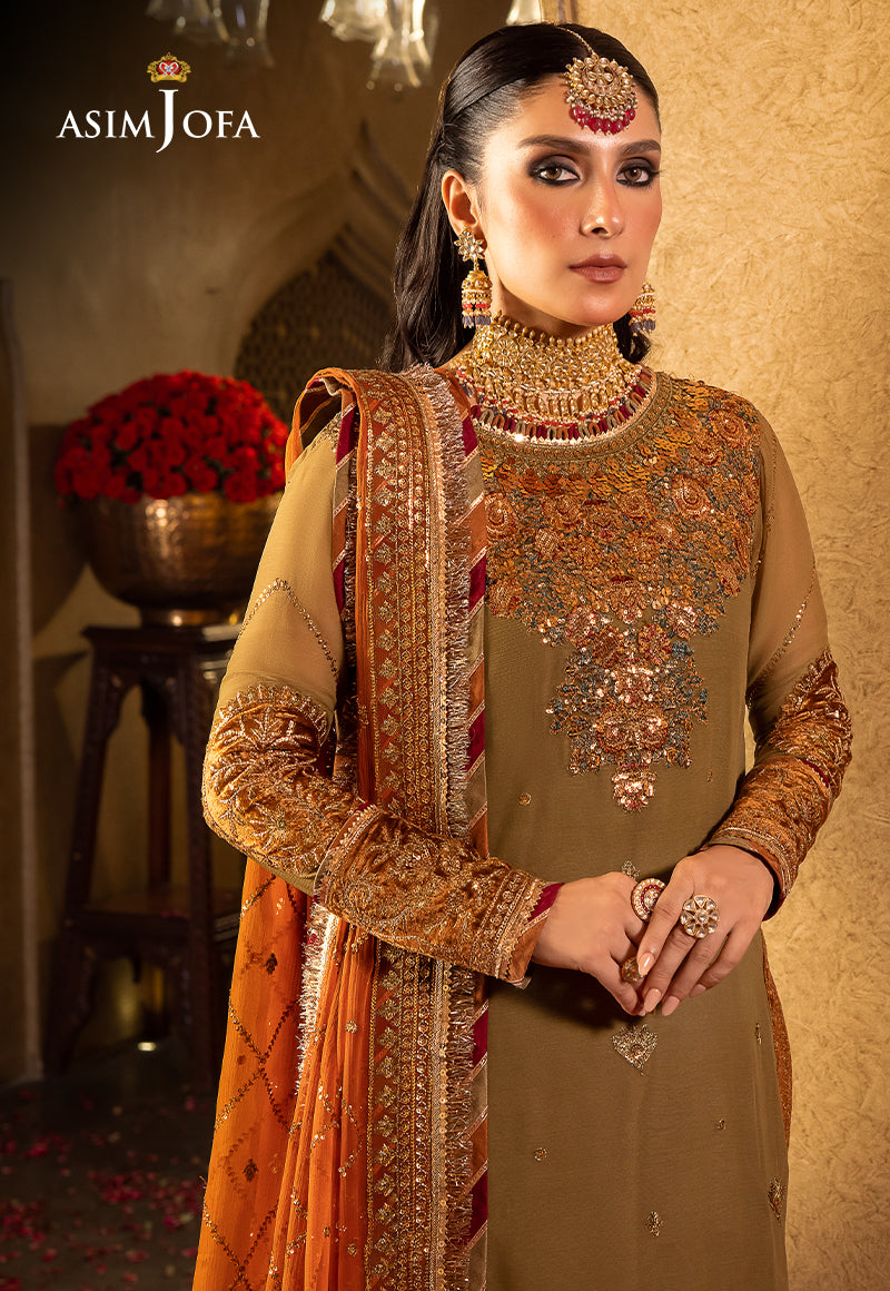 Embrace a world of timeless grandeur with this olive-green ensemble graced by a bronze hued dupatta, a true gem from Asim Jofa's “Velvet Festive Collection”. The fabric tells a tale of opulence adorned with intricate antique gold and Indian gold zariwork embroidery with the additional charm of dual sequins in 7mm and 3mm shimmering in the hues of bronze. The motifs reminiscent of the artistry found in Tanjore painting are a work of art with threads in shades of light and dark rust, maroon, and green weaving a vivid tapestry of creativity. The chaak of the shirt, the daman, sleeves, and bunches are adorned in rust-colored velvet casting a majestic spell and a striking contrast like a dream painted on velvet canvas.