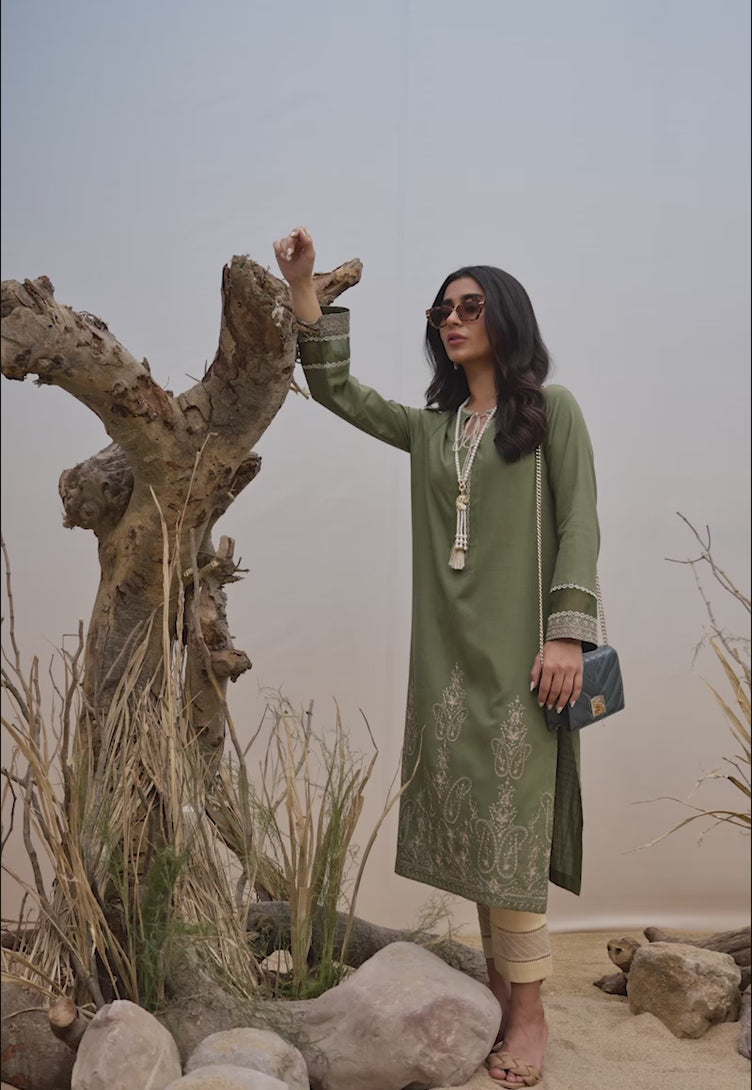 A beautiful ivory thread embroidered shirt sprawled on a sage green base. A straight-cut shirt and delicate tassel adorn the neckline.