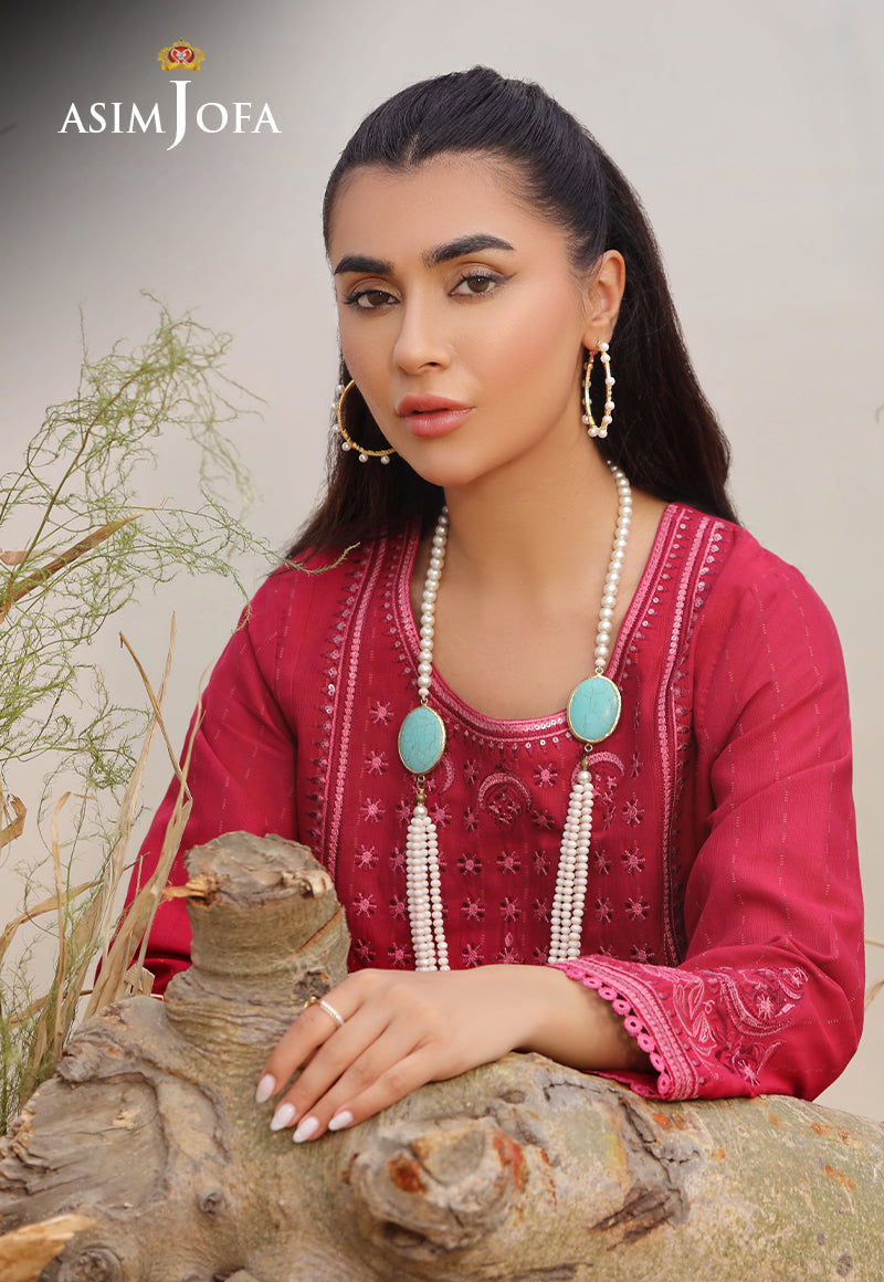 Immerse yourself in ethnic elegance with this Fuchsia pink self-jacquard shirt, adorned with sequins embroidery that adorns the front and sleeves border, offering a harmonious blend of trend and tradition.