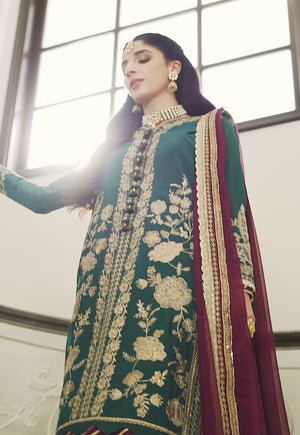 Unveil the epitome of elegance as Mawra Hocane graces the runway in the exquisite 'ZARI SITARA' ensemble. Immerse yourself in the allure of chanderi cotton and chiffon, as this marvel envelops you in a world of sheer opulence. The forest green shirt, adorned with intricate floral embroidery and shimmering sequins, radiates regal splendor. Paired with a captivating deep pink dupatta, this ensemble becomes a harmonious blend of vibrant hues. Embrace the allure of 'ZARI SITARA'—where luxury meets artistry.